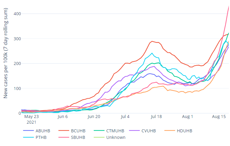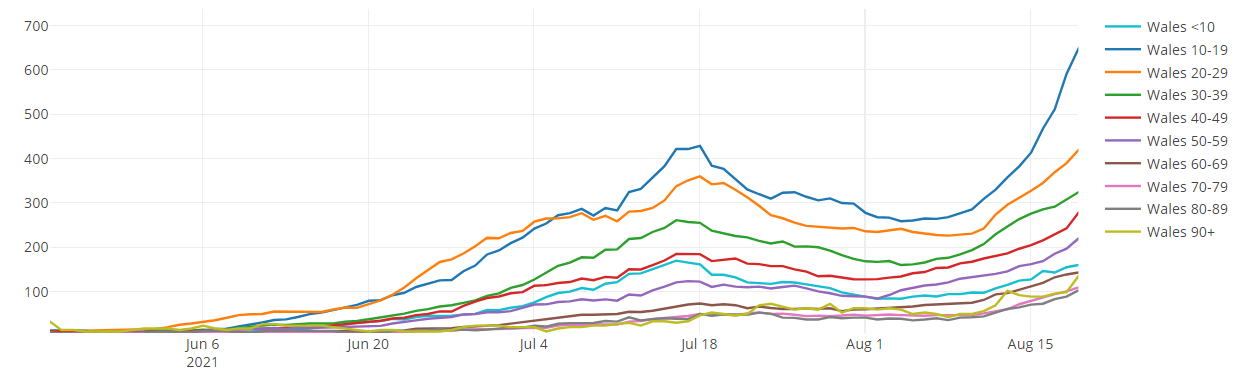 At a Wales level, on 20 August 2021, the 7-day rolling incidence of COVID-19 cases and percentage of people testing positive for COVID-19 have sharply increased since last week.