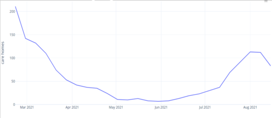 The number of care homes in 'red' status (an ongoing outbreak/incident reported within the last 7 days) was not available from the National Situation Background Assessment Recommendation (SBAR) report covering the week of 16 August 2021 to 22 August 2021. Source: National SBAR