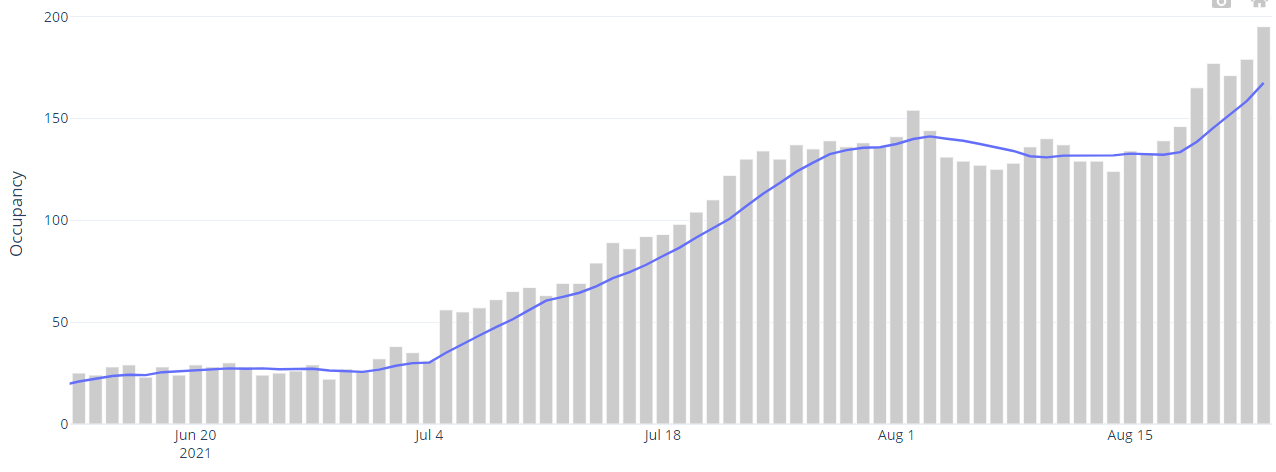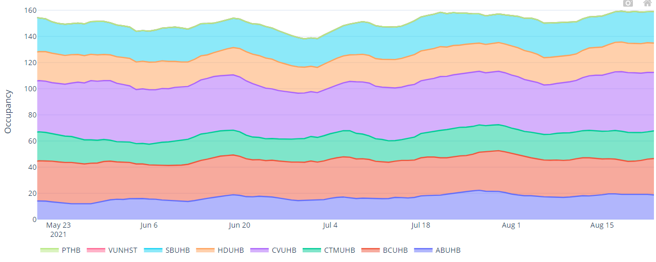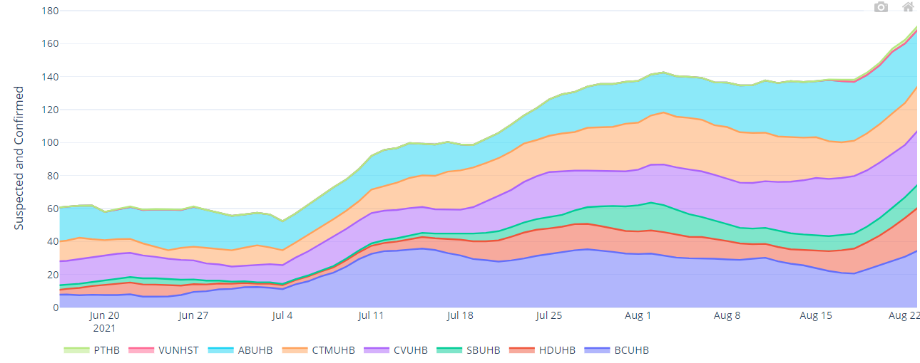 From early-July 2021, COVID-19 pressure on the NHS has been generally increasing. As at 25 August 2021, there were 309 COVID-19 related patients (Suspected, Confirmed and Recovering) occupying a hospital bed. This compares to 220 (89 more occupied beds) on 18 August 2021. Confirmed patients accounted for 209 of the total occupied beds.