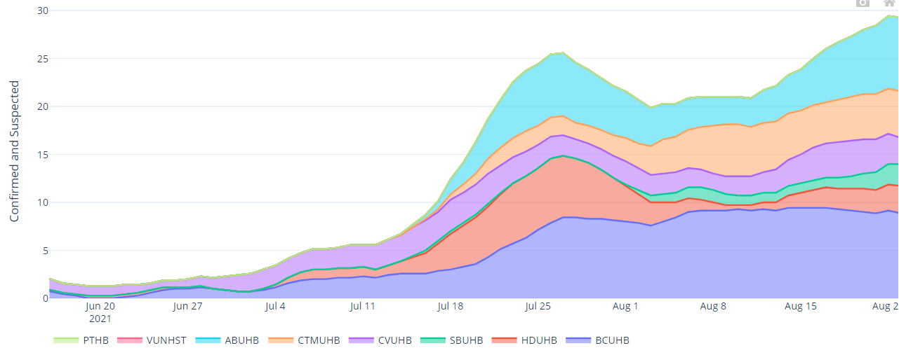 From early-July 2021, COVID-19 pressure on the NHS has been generally increasing.