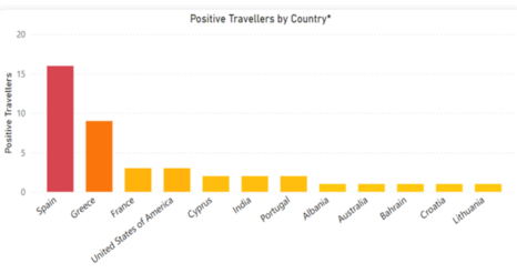 Spain continues to see significant rises in arrivals with an increase of 528 over last week. Greece and France also had significant rises. Spain continues to have the highest numbers of arrivals testing positive on return (16 positive travellers last week), with a positivity rate of 0.35%, although this has decreased when comparing to the previous week (24 positive travellers, 0.60% positivity rate). Greece had 9 positive travellers last week (0.50% positivity rate) and the USA had 3 positive travellers (0.65% positivity rate).