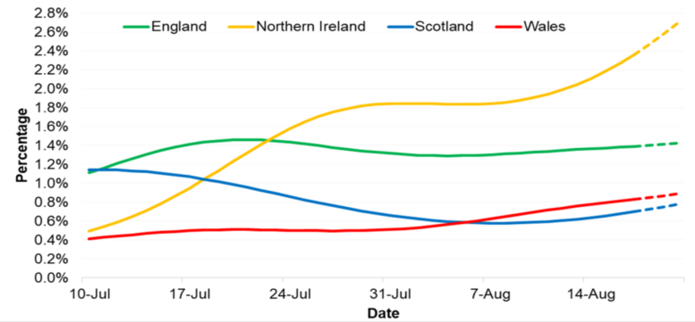 The percentage of people testing positive has increased in all four UK nations in the most recent week. Positivity is highest in Northern Ireland and lowest in Scotland.