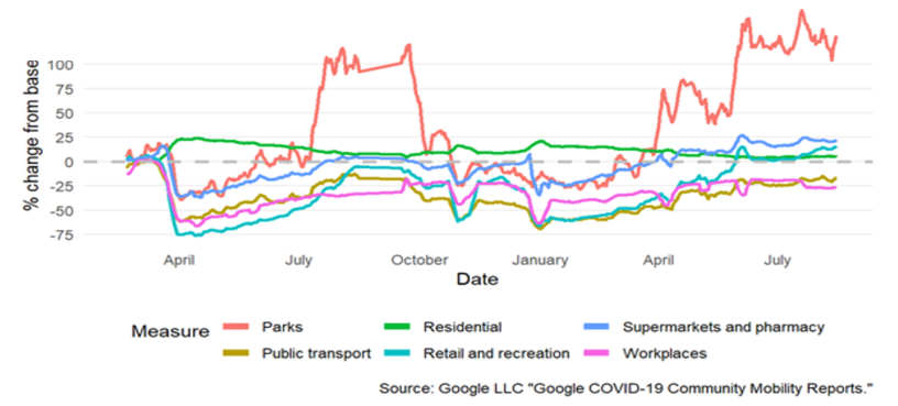 The latest mobility data shows increases in the latest week across most categories compared to the previous week with reductions in people spending time at home. The baseline for much of the data is during January to February 2020 and changes are relative to that period. It is not possible to determine if mobility is higher/lower than would have been expected prior to the pandemic as data for 2019 or earlier years is not published.