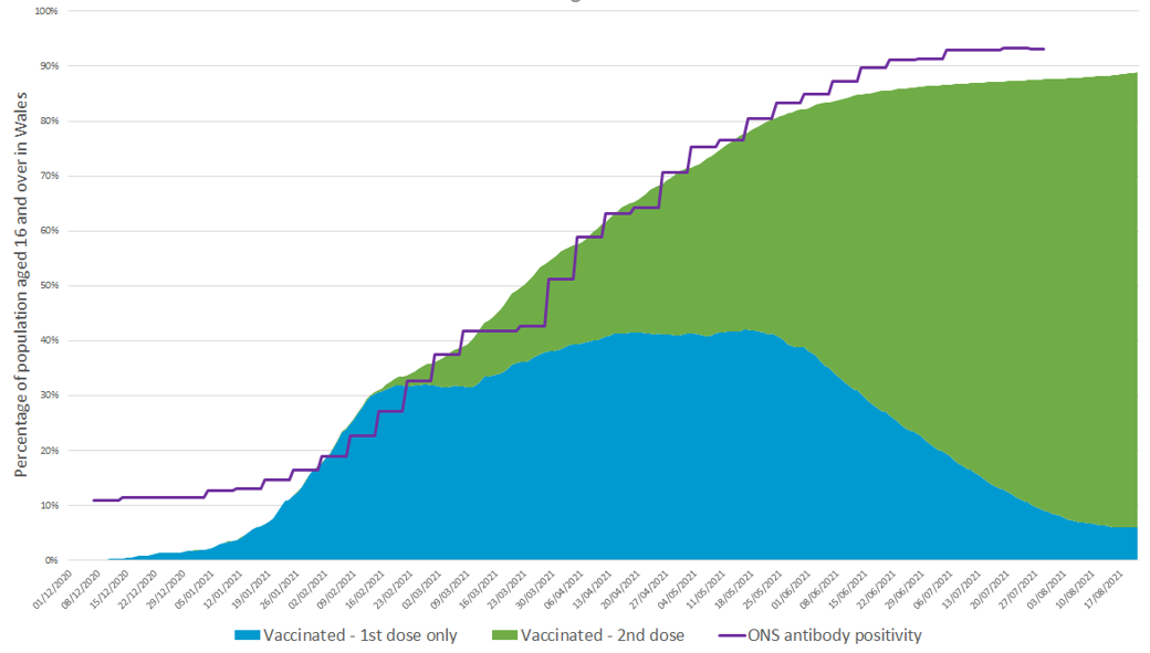 Between 26 and 29 July 2021, the ONS COVID-19 Infection Survey estimated that 93.2% of the community population aged 16 and over in Wales tested positive for COVID-19 antibodies.