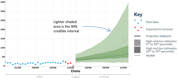 Projected to increase to over 50 per day over the next three weeks. Source: Modelled medium term projections, SAGE/SPI-M, 25 August
