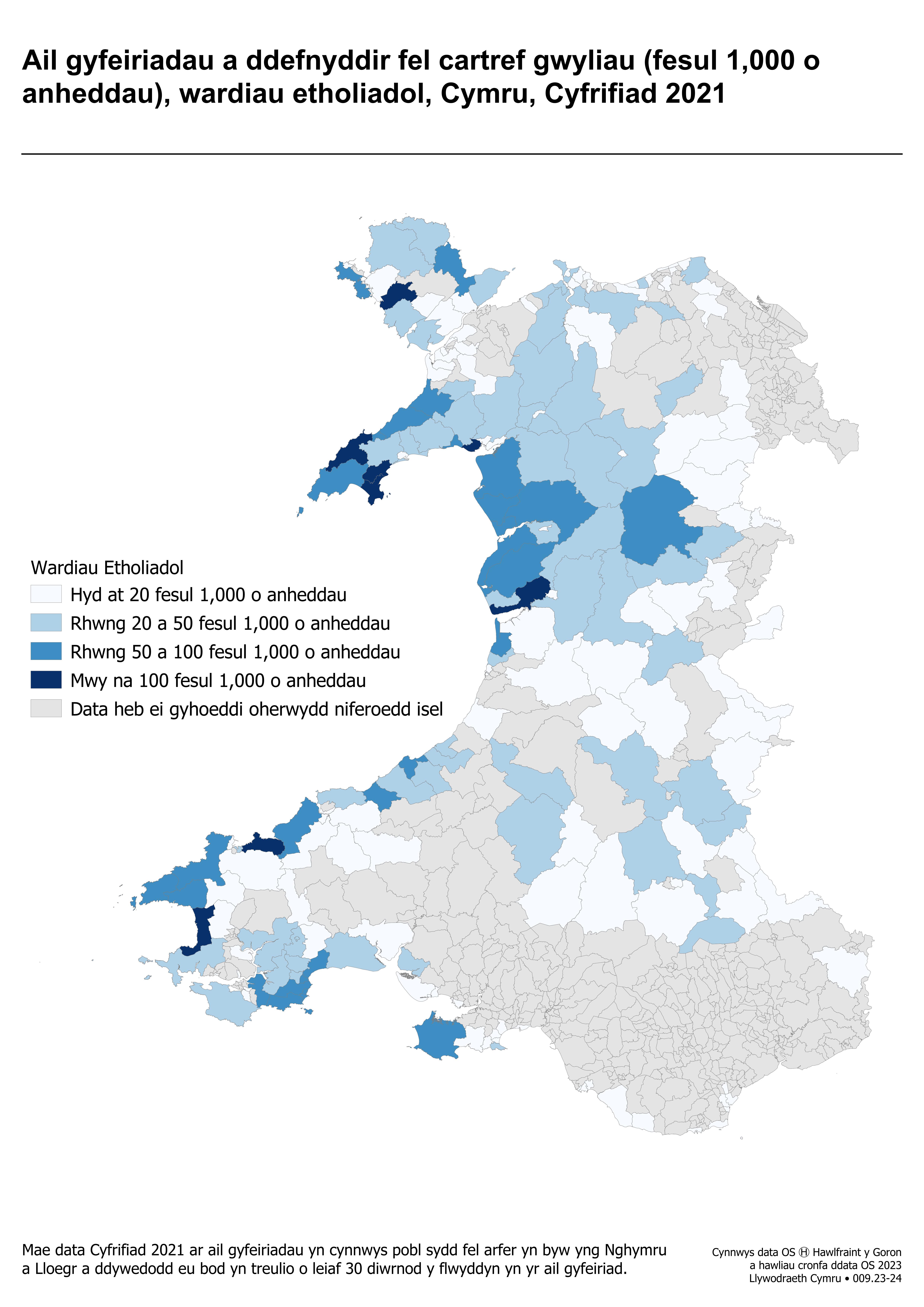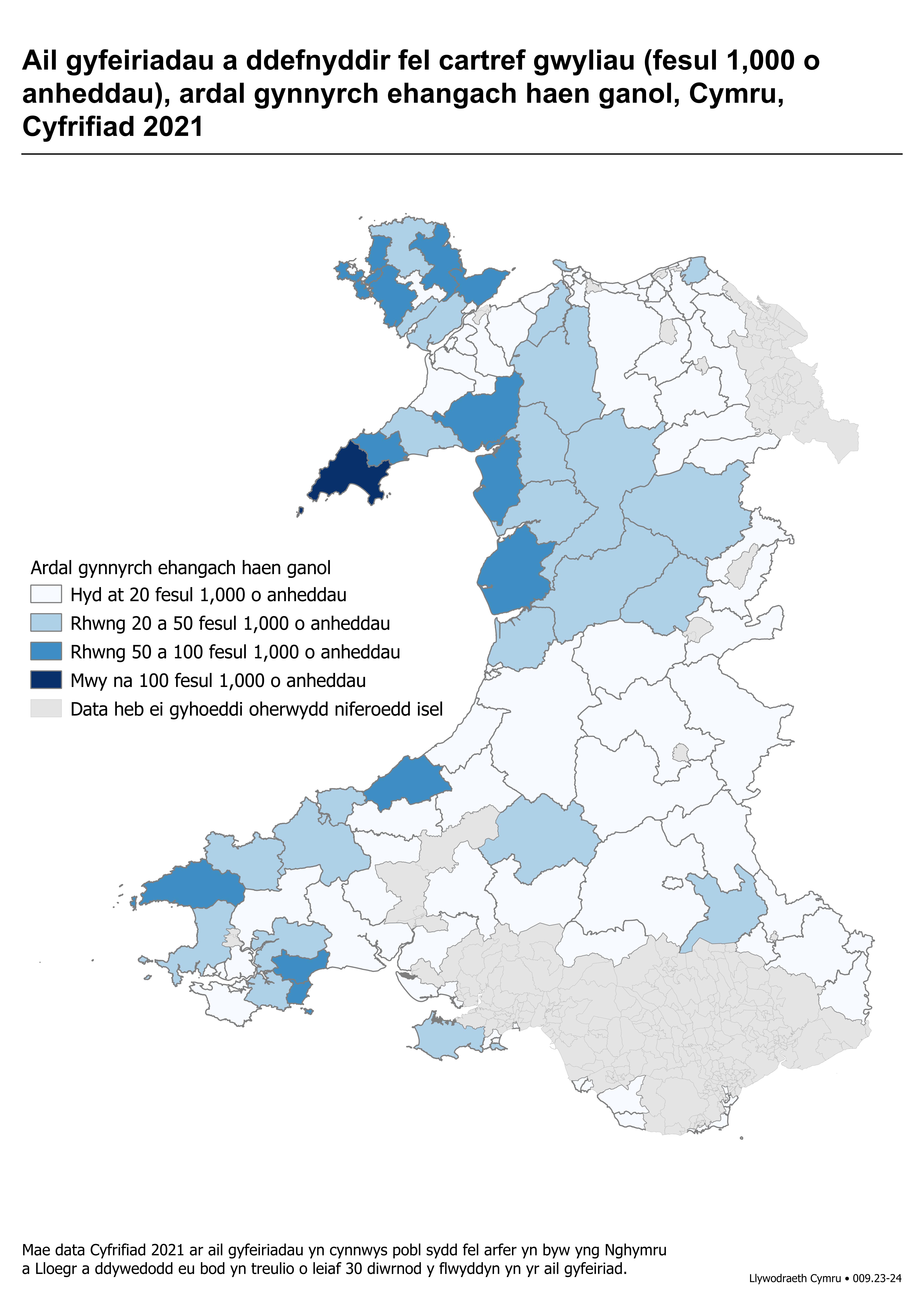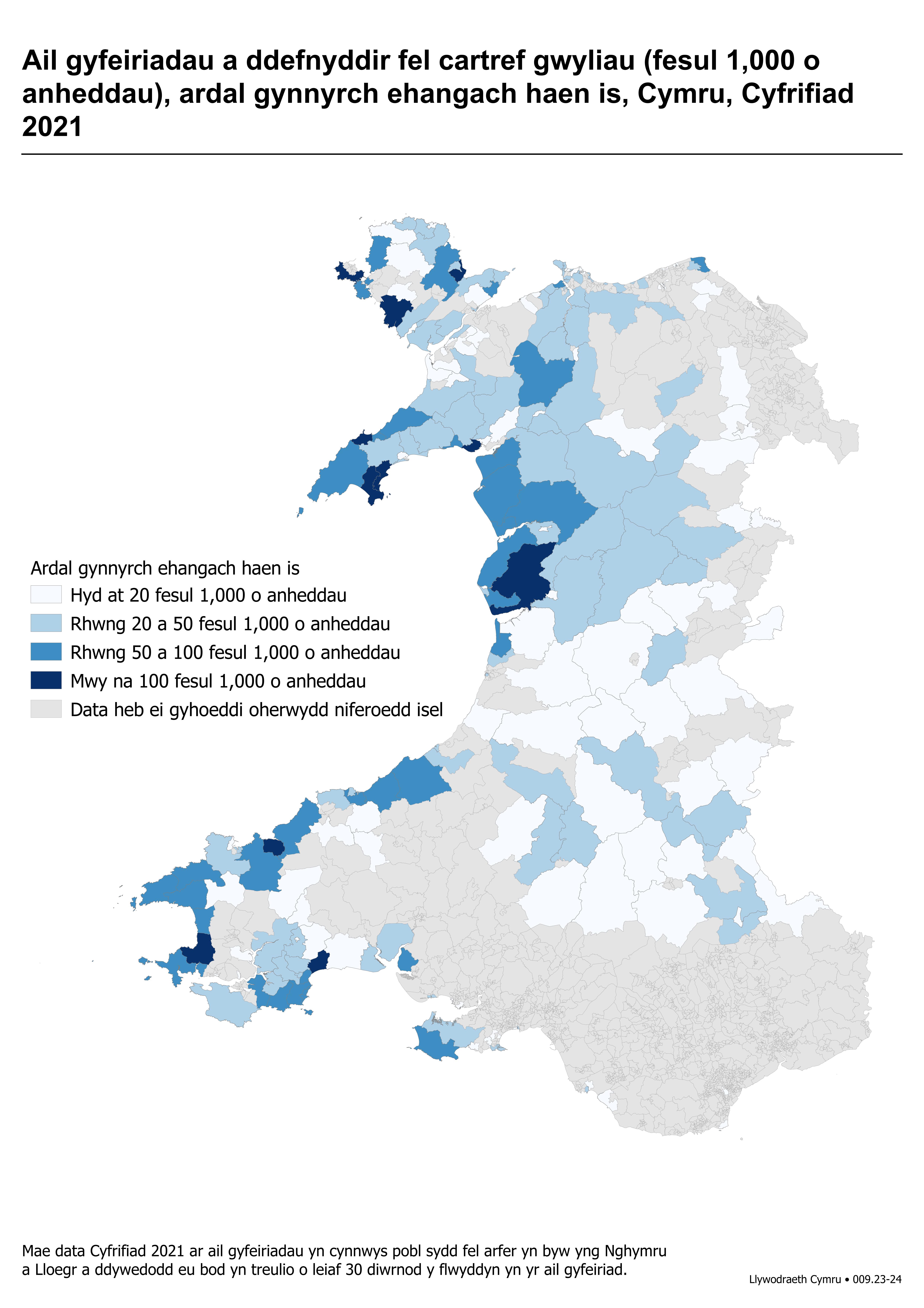 Mae data hefyd ar gael ar gyfer wardiau etholiadol ac yn y map isod.