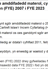 Gan fod ffigurau yn seiliedig ar gyfartaleddau treigl 3 blynedd, golyga hyn, ar gyfer FYE 2023, nid oes modd cymharu amcangyfrifon o amddifadedd materol yn llwyr â'r cyfnod cyn y pandemig. Mae rhagor o wybodaeth am ansawdd data FYE 2022 ac FYE 2023 ar gael adroddiad technegol yr Adran Gwaith a Phensiynau.