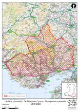 Yr ardal o amgylch De-ddwyrain Cymru gyda chyfyngiadau i atal Phytophthora Pluvialis rhag lledaenu.