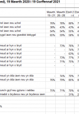 Mae canfyddiadau o'r bygythiadau a achosir gan y coronafeirws wedi codi ar ôl lleihau dros y camau diwethaf. Wrth i'r broses o gyflwyno brechu parhau ac wrth i'r cyfyngiadau ddechrau cael eu lleddfu yng Nghymru, mae’r gyfran sy'n credu bod coronafeirws yn fygythiad uchel iddynt yn bersonol a'u gwlad yn parhau ar lefelau isaf.