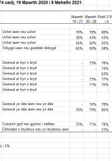 Mae canfyddiadau o'r bygythiadau a achosir gan coronafeirws ar eu lleiaf. Wrth i'r broses o gyflwyno brechu parhau ac wrth i'r cyfyngiadau ddechrau cael eu lleddfu yng Nghymru, mae’r gyfran sy'n credu bod coronafeirws yn fygythiad uchel iddynt yn bersonol a'u gwlad wedi aros ar lefelau isaf.