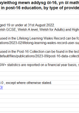 - Gweithgareddau dysgu cyfrwng Cymraeg a dwyieithog mewn addysg ôl-16, yn ôl math o ddarparwr: Medi 2022 i Awst 2023