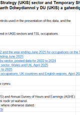 Ystadegau cyflogaeth ac enillion yn ôl sector Strategaeth Ddiwydiannol y DU (UKIS) a galwedigaethau Rhestr Prinder Dros Dro (TSL), Cymru a'r DU , Saesneg yn unig, math o ffeil: ODS, maint ffeil: 16 KB