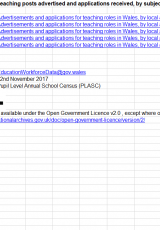 Swyddi a hysbysebwyd a'r ceisiadau a dderbyniwyd, yn ôl pwnc ac awdurdod lleol, 2012 i 2016 , Saesneg yn unig, math o ffeil: ODS, maint ffeil: 54 KB