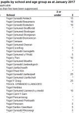 - Disgyblion yn ôl ysgol a grŵp oedran, 2017 a 2018