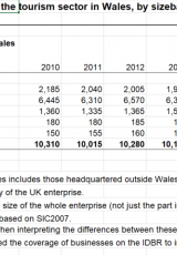 Mentrau gweithredol yn y sector twristiaeth yng Nghymru, yn ôl band maint, 2010 i 2020 , Saesneg yn unig, math o ffeil: ODS, maint ffeil: 7 KB