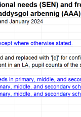 Nifer y disgyblion sydd â datganiadau o anghenion addysgol arbennig (AAA) a hawl i brydau ysgol am ddim (PYD), 2023 a 2024 , Saesneg yn unig, math o ffeil: ODS, maint ffeil: 15 KB