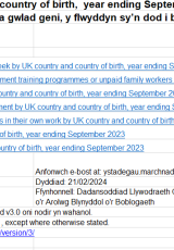 Ystadegau marchnad lafur yn ôl gwlad y DU a gwlad geni, y flwyddyn sy’n dod i ben ym mis Medi 2023 , Saesneg yn unig, math o ffeil: ODS, maint ffeil: 12 KB