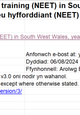 Pobl ifanc heb fod mewn addysg, cyflogaeth neu hyfforddiant (NEET) yn Ne-orllewin Cymru, blwyddyn yn dod i ben Mawrth 2020 i Fawrth 2024 , Saesneg yn unig, math o ffeil: ODS, maint ffeil: 6 KB