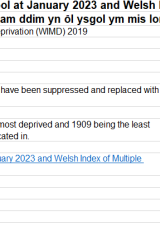 - Canran y disgyblion rhwng 5 a 15 oed sy'n gymwys i gael prydau ysgol am ddim yn ôl ysgol ym mis Ionawr 2023 a safle Mynegai Amddifadedd Lluosog Cymru (MALlC) 2019