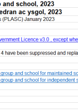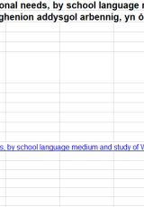 - Disgyblion Blynyddoedd 1 i 11 ag anghenion dysgu ychwanegol neu anghenion addysgol arbennig, yn ôl cyfrwng iaith yr ysgol ac a chyfrwng astudio'r Gymraeg, Ionawr 2023