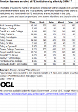 Dysgwyr sydd wedi cofrestru mewn sefydliadau addysg bellach yn ôl ethnigrwydd, Awst 2016 i Gorffennaf 2017 , Saesneg yn unig, math o ffeil: ODS, maint ffeil: 17 KB
