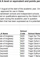Cyflawni AAB ar lefel safon uwch neu’n gyfwerth a phwyntiau fesul cofnod arholiad ar gyfer disgyblion 17 oed, Medi 2018 i Awst 2019 , Saesneg yn unig, math o ffeil: ODS, maint ffeil: 20 KB