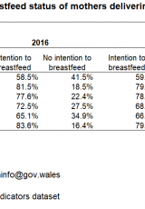 Statws y bwriad i fwydo ar y fron gan famau sy'n disgwyl rhoi genedigaeth yng Nghymru yn ôl ethnigrwydd, 2016 i 2019 , Saesneg yn unig, math o ffeil: ODS, maint ffeil: 103 KB