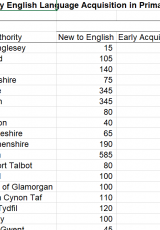 • Disgyblion yn ôl caffaeliad iaith Saesneg mewn ysgolion cynradd ac uwchradd yn ôl awdurdod lleol, 2020