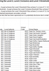 Disgyblion sy'n cyflawni trothwy lefel 2, lefel 2 cynhwysol a lefel 3 fesul ysgol, Medi 2018 i Awst 2019 , Saesneg yn unig, math o ffeil: ODS, maint ffeil: 34 KB