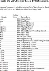 Ysgolion gyda dysgyblion yn cofrestru mewn arholiadau Lladin, Groegaidd neu Gwareiddiad Clasurol Medi 2015 i Awst 2019 , Saesneg yn unig, math o ffeil: ODS, maint ffeil: 18 KB