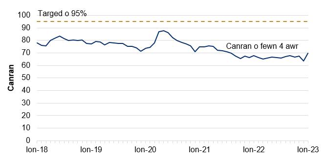 Ffynhonnell: Amseroedd aros Rhwng Atgyfeirio a Thriniaeth, Iechyd a Gofal Digidol Cymru (DHCW) (Canran y llwybrau cleifion sy’n aros i ddechrau triniaeth o fewn y targed amser fesul mis a grwpiau o wythnosau ar StatsCymru)