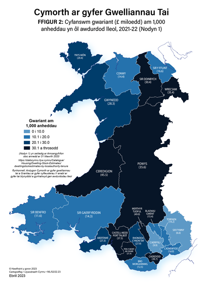 Disgrifiad o Ffigur 2: Mae map yn dangos fod y gwariant mwyaf ar gyfer pob 1,000 o anheddau wedi'u canfod yn Merthyr Tudful, Ceredigion, Caerdydd, Castell-nedd Port Talbot, Powys, Wrecsam, Pen-y-bont ar Ogwr a Sir Ddinbych, gyda dros £30,000 wedi'i wario fesul 1,000 o anheddau.