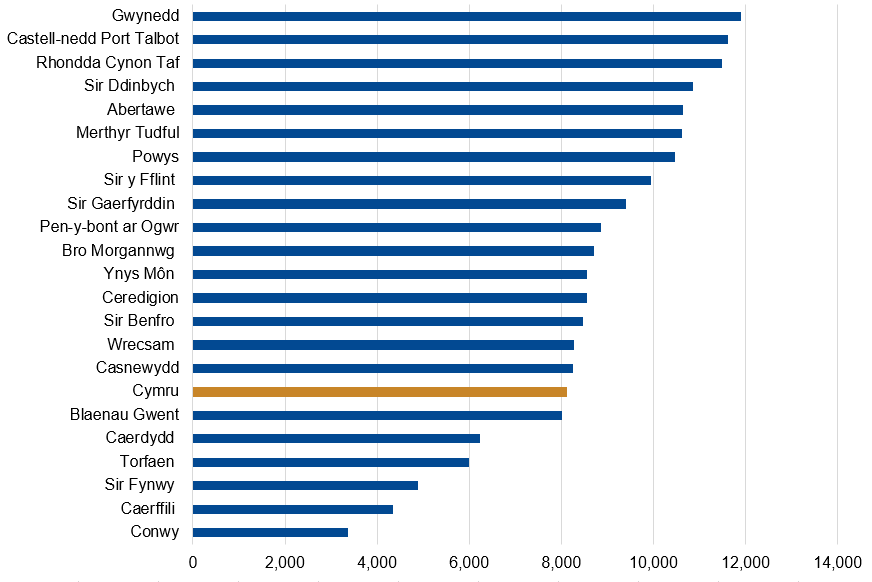 O gymharu â 2020-21, gwelwyd y cynnydd mwyaf o ran gwariant cyffredinol ym Merthyr Tudful (o £150,000 i £1.3 miliwn) a Chastell-nedd Port Talbot (o £1.4 miliwn i £2.5 miliwn). Gwelwyd y cynnydd mwyaf o ran gwariant fesul 1,000 o anheddau hefyd ym Merthyr Tudful (o £6,000 i £49,000) a Chastell-nedd Port Talbot (o £21,000 i £37,500).