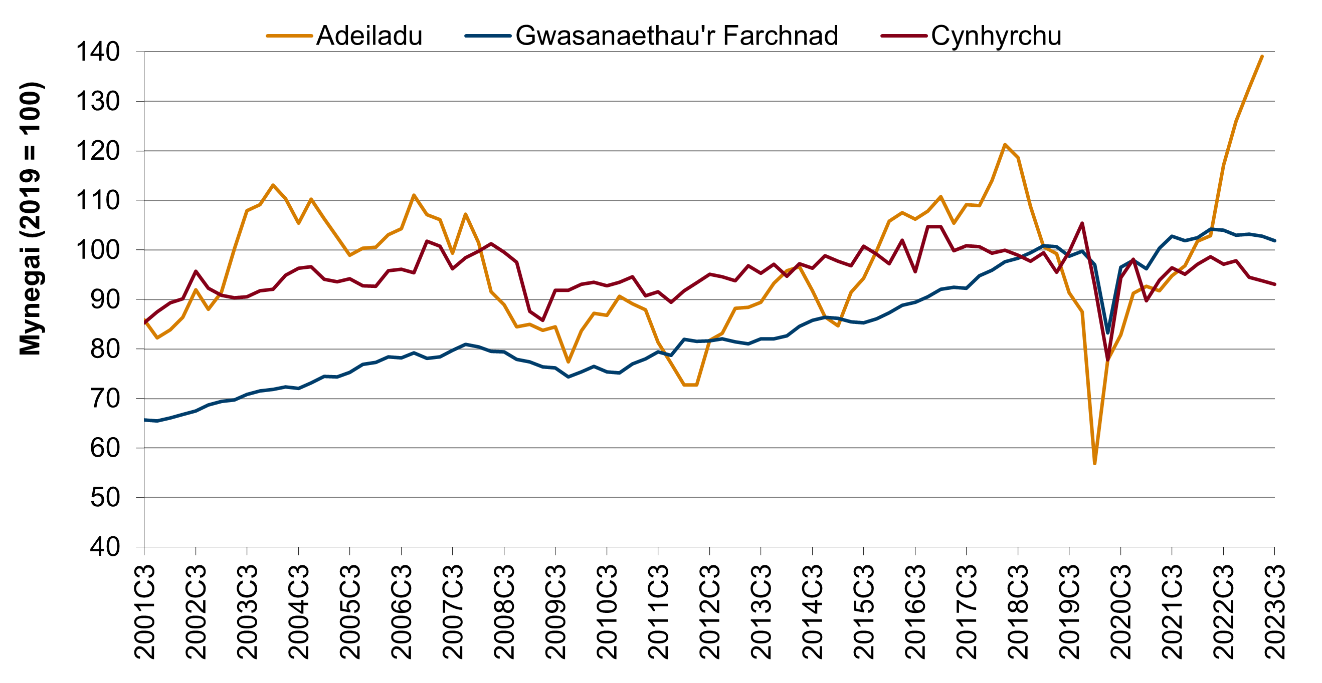 Disgrifiad o Ffigur 1: Dengys y siart y gyfres amser ar gyfer mynegai cynhyrchu, adeiladu a gwasanaethau’r farchnad ers 2000. Y tueddiad ar y cyfan yw bod y mynegai gwasanaethau’r farchnad a chynhyrchu wedi cynyddu ers 2000, tra bo’r mynegai adeiladu wedi amrywio dros yr un cyfnod amser. Gwelwyd gostyngiad sylweddol ym mhob mynegai yn Chwarter 2 2020 yn sgil pandemig y coronafeirws, ond maent wedi adfer rhywfaint neu’n llwyr ers hynny.