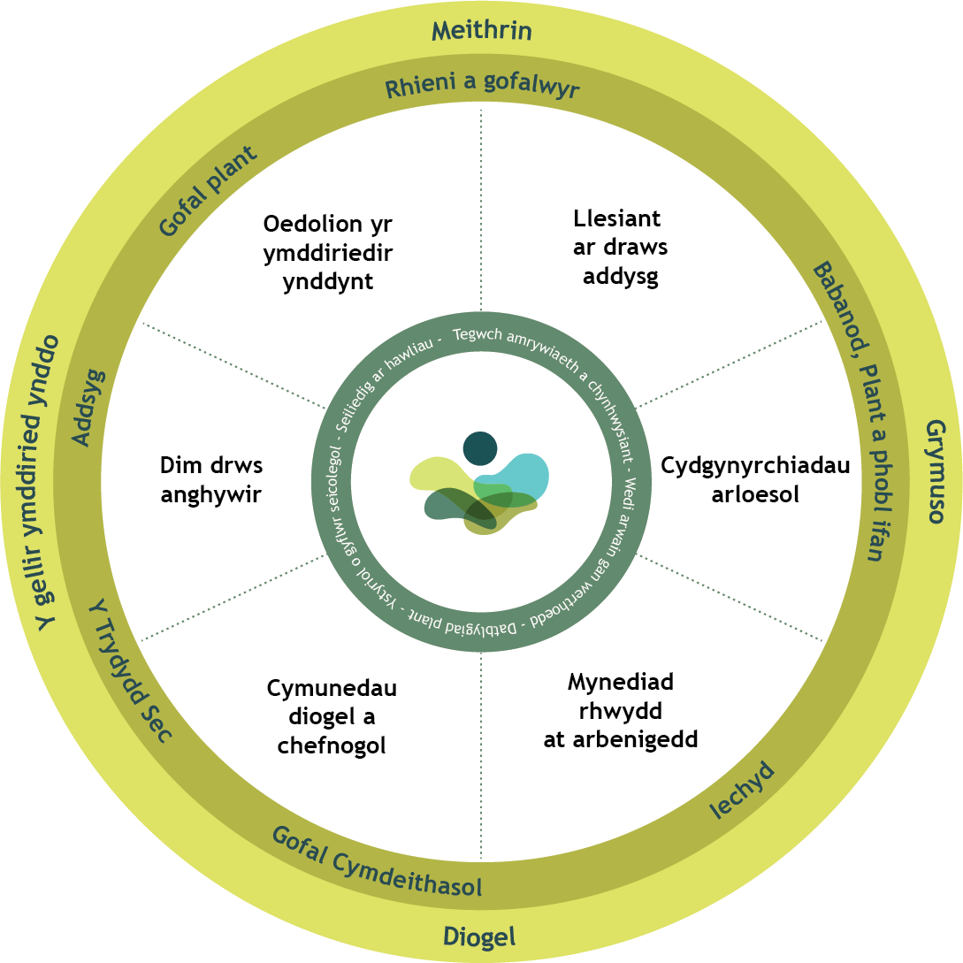 Mae fframwaith NYTH yn cydnabod bod iechyd meddwl a llesiant yn ddibynnol ar lawer o wahanol bethau. Rydym am i'r rhai sy'n darparu cymorth iechyd meddwl ystyried y ffactorau ehangach sy’n cael effaith bendant ar ganlyniadau iechyd meddwl.