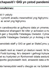 Mae ystadegau am absenoldeb staff y GIG ar gael ar StatsCymu yn ogystal â’r holl ystadegau eraill yn y datganiad hwn. Yn ogystal, cyhoeddir gwybodaeth am welyau, nifer y cleifion yn yr ysbyty a derbyniadau i’r ysbyty ar ddyddiau'r wythnos ar StatsCymru am 12 yp ac mae hyn yn cynnwys data hyd at y diwrnod cynt. Ar ôl 12yp ar ddydd Iau, ni fydd y data a ddangosir yn y datganiad yma yn cynnwys y data cyhoeddedig diweddaraf. Fodd bynnag, mae'r datganiad wythnosol yma yn rhoi sylwebaeth ychwanegol ar dueddiadau yn y data.