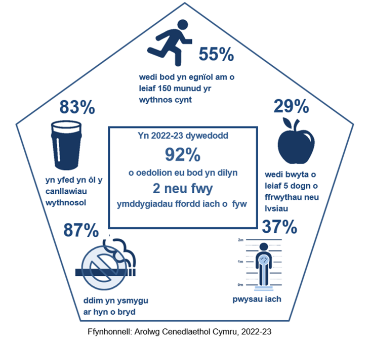 Roedd y mwyafrif (92%) o oedolion yn dweud eu bod yn dilyn dau neu fwy o’r pum ymddygiad ffordd o fyw iach. Mae hyn yn cynnwys peidio ag ysmygu, yfed o fewn y canllawiau wythnosol, bwyta pum dogn neu fwy o ffrwythau neu lysiau y diwrnod blaenorol, bod yn gorfforol egnïol am 150 munud neu fwy'r wythnos flaenorol, a bod yn bwysau iach. Roedd 30% o oedolion yn dilyn pedwar neu bump ymddygiad ffordd iach o fyw.