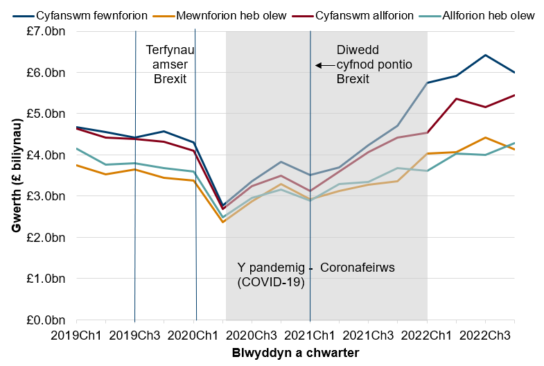 Disgrifiad Ffigwr 1: Siart llinell sy'n dangos y disgynnodd masnach yn sydyn ar ddechrau 2020 oherwydd y pandemig. Mae cynnydd yn y Chwarteri diweddar wedi gweld allforion a mewnforion yn fwy na'u lefelau cyn y pandemig.