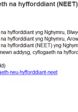 - Ar y cyfan, roedd cyfran y bobl ifanc 16 i 18 oed sy’n NEET wedi bod yn gostwng yn raddol rhwng 2011 a 2017, ond wedi cynyddu rhywfaint yn 2018 a 2019. Mae maint y cynnydd hwn yn amrywio yn dibynnu ar y ffynhonnell a ddefnyddir.