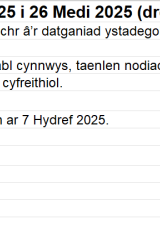 Os oes angen fersiwn fwy hygyrch o’r ddogfen hon arnoch, e-bostiwch digidol@llyw.cymru. Dywedwch wrthym pa fformat sydd ei angen. Os ydych yn defnyddio technoleg gynorthwyol, nodwch fanylion.