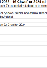 - Yr wythnos diweddaraf yw 5 i 9 Chwefror, a’r wythnos flaenorol yw 29 Ionawr i 2 Chwefror. Roedd ysgolion ar gau ar gyfer hanner tymor rhwng 12 a 16 o Chwefror.