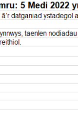 - Yr wythnos ddiweddaraf yw 5 i 9 Rhagfyr 2022, a’r wythnos flaenorol yw 28 Tachwedd i 2 Rhagfyr 2022.