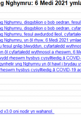 Cyhoeddodd Llywodraeth Cymru ar 15 Medi 2021 y byddai GIG Cymru yn dechrau cynnig y brechlyn COVID-19 i bobl ifanc rhwng 12 a 15 oed o 4 Hydref 2021. Gall cyflwyno'r rhaglen frechu hon hefyd effeithio ar y ffigurau yn y datganiad hwn.