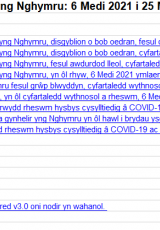 Cyhoeddodd Llywodraeth Cymru ar 15 Medi 2021 y byddai GIG Cymru yn dechrau cynnig y brechlyn COVID-19 i bobl ifanc rhwng 12 a 15 oed o 4 Hydref 2021. Gall cyflwyno'r rhaglen frechu hon hefyd effeithio ar y ffigurau yn y datganiad hwn.