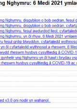 Cyhoeddodd Llywodraeth Cymru ar 15 Medi 2021 y byddai GIG Cymru yn dechrau cynnig y brechlyn COVID-19 i bobl ifanc rhwng 12 a 15 oed o 4 Hydref 2021. Gall cyflwyno'r rhaglen frechu hon hefyd effeithio ar y ffigurau yn y datganiad hwn.
