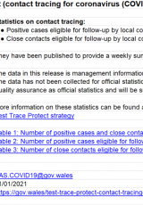 Gwybodaeth rheoli yw’r data hyn a ddarparwyd i Lywodraeth Cymru gan GIG Cymru Gwasanaeth Gwybodeg. Rydym yn cyhoeddi hyn er mwyn rhoi crynodeb wythnosol o weithgarwch olrhain cysylltiadau yng Nghymru yn ystod pandemig y coronafeirws (COVID-19). Nid yw’r data hyn wedi mynd drwy’r un lefel o sicrhau ansawdd ag ystadegau swyddogol a gellid diwygio’r data yn y dyfodol.