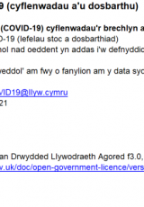 Nid yw'r datganiad hwn yn cynnwys ystadegau am y bobl sydd wedi cael eu brechu. Caiff data ar y brechiadau a roddir eu cyhoeddi bob dydd a phob wythnos, a hynny ar Ddangosfwrdd Gwyliadwriaeth COVID-19 Cyflym Iechyd Cyhoeddus Cymru, gyda'r data wythnosol yn rhoi dadansoddiadau manylach.