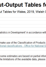 Mae Llywodraeth Cymru wedi cynhyrchu cyfres o Dablau Cyflenwad a Defnydd (SUTs) a Thablau Mewnbwn-Allbwn (IOTs) ar gyfer 2019. Mae'r tablau hyn yn rhoi cipolwg ar Economi Cymru ac yn manylu ar y perthnasoedd prynu a gwerthu nwyddau a gwasanaethau rhwng pob rhan ohoni. Cyhoeddir tablau tebyg hefyd gan Lywodraeth yr Alban ac Asiantaeth Ystadegau ac Ymchwil Gogledd Iwerddon (NISRA), yn ogystal â chan yr ONS ar gyfer y DU gyfan.
