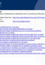 Tanau llosgi bwriadol, Ebrill 2019 i Fawrth 2020: tablau , Saesneg yn unig, math o ffeil: ODS, maint ffeil: 114 KB