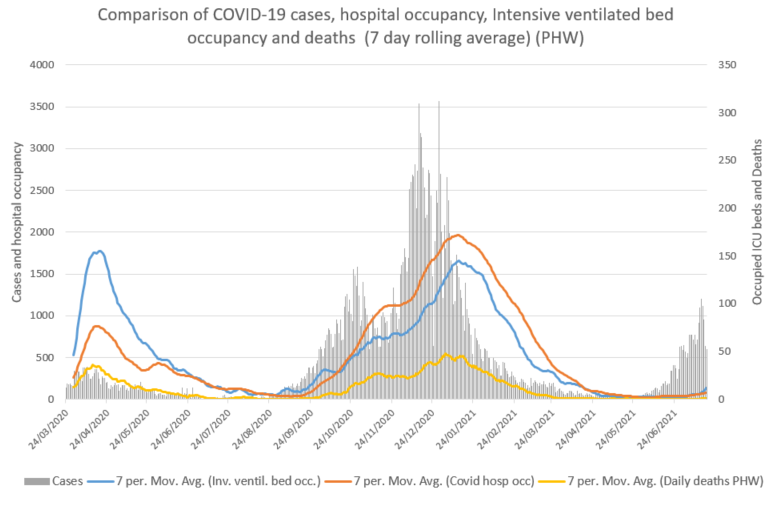 Since the beginning of June, the 7 day average of cases have increased from 37 to 805, COVID-19 Invasive ventilated bed occupancy from 3 to 16, COVID hospital occupancy from 10 to 92 and deaths from 0 to 11 (data as at 20 July). Of the 7,813 Delta variant cases of detected as at 20 July 99, or 1.3%, have been hospitalised (Source PHW).